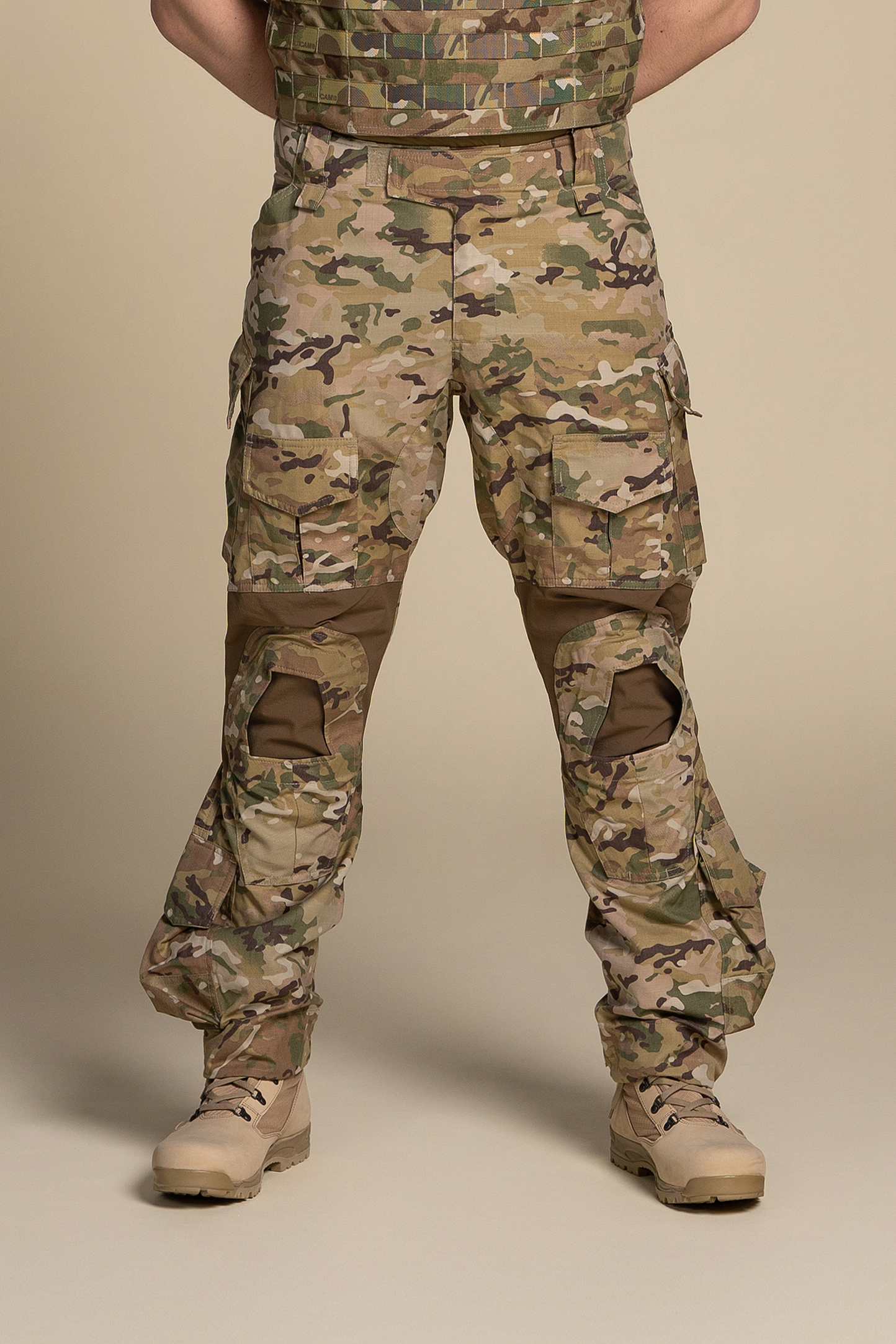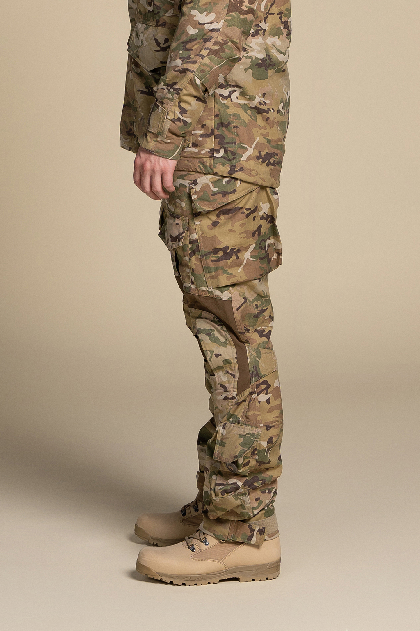 - Pockets: angled side pockets with a tightening system to adjust the position of the knee pads pockets with flaps on thigh, pockets with flaps on knees, pockets with flaps on legs