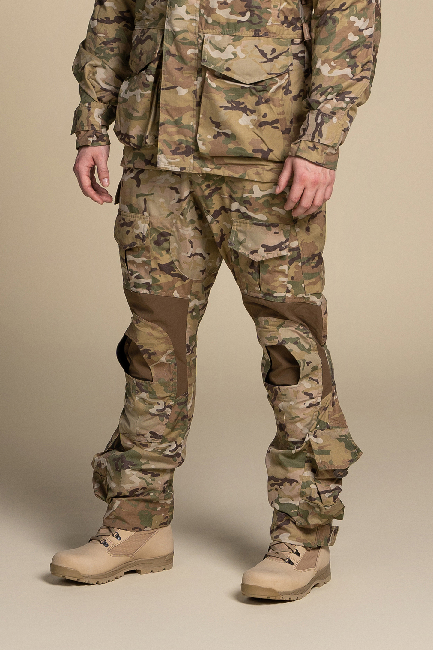 - A reinforcement piece above the knee with an opening for adding knee pads.