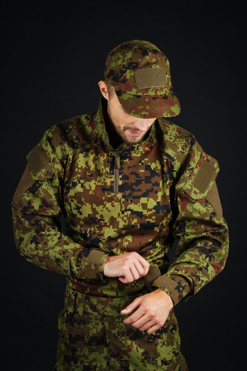 - Mõlema varruka ülaosas on pealeõmmeldud ning nööbi ja tekstiillukuga suletavad taskud.