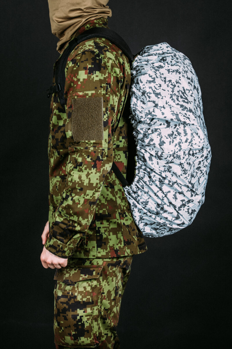 Talvise camo mustriga seljakoti kate. Valikus on kaks suurust 40L ja 80L.